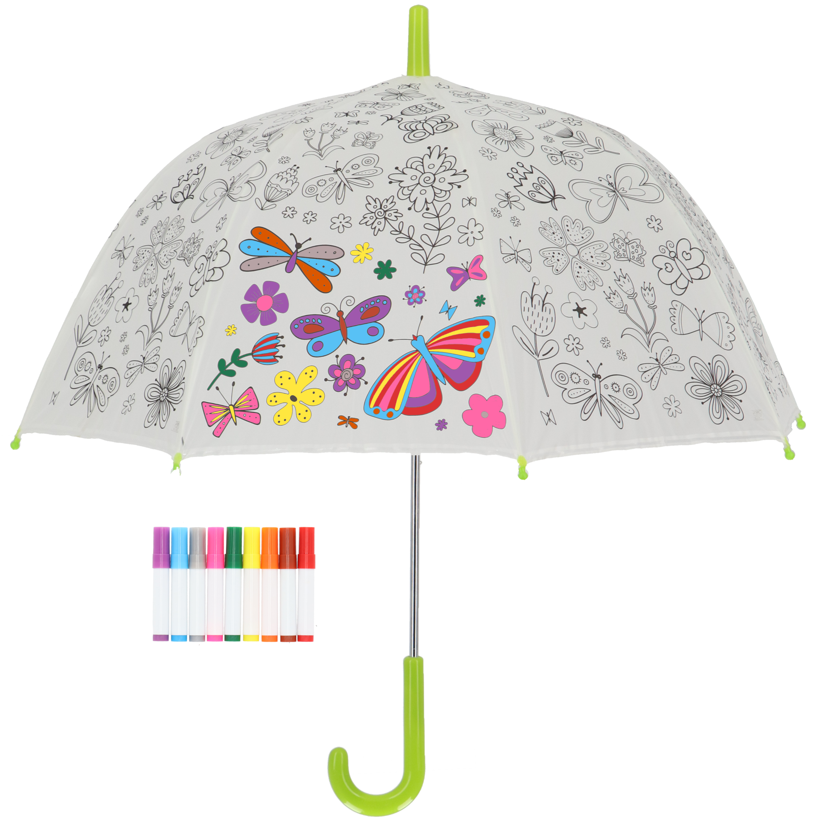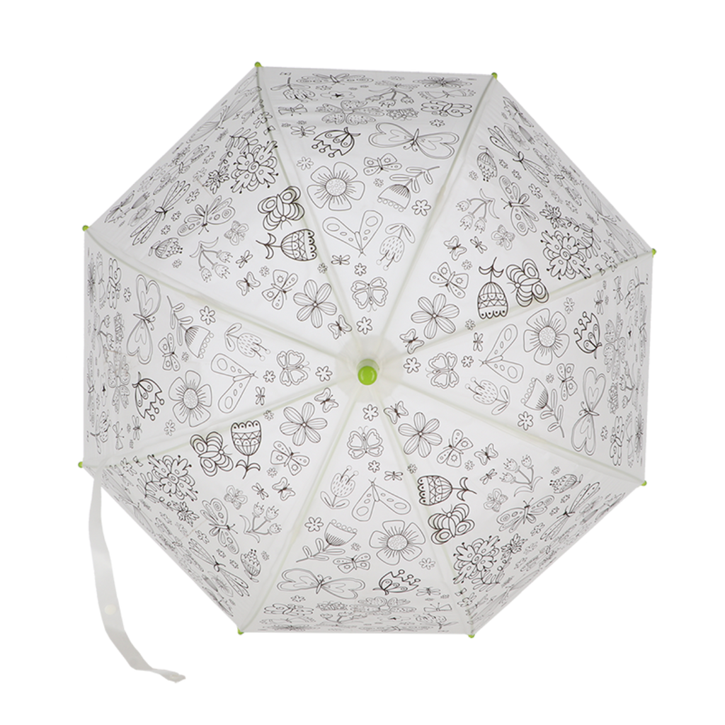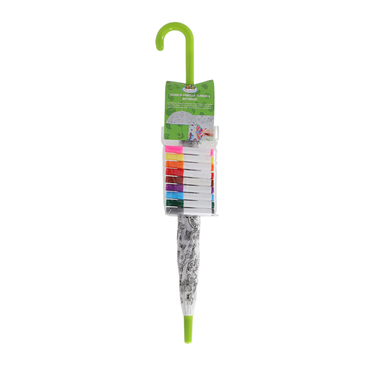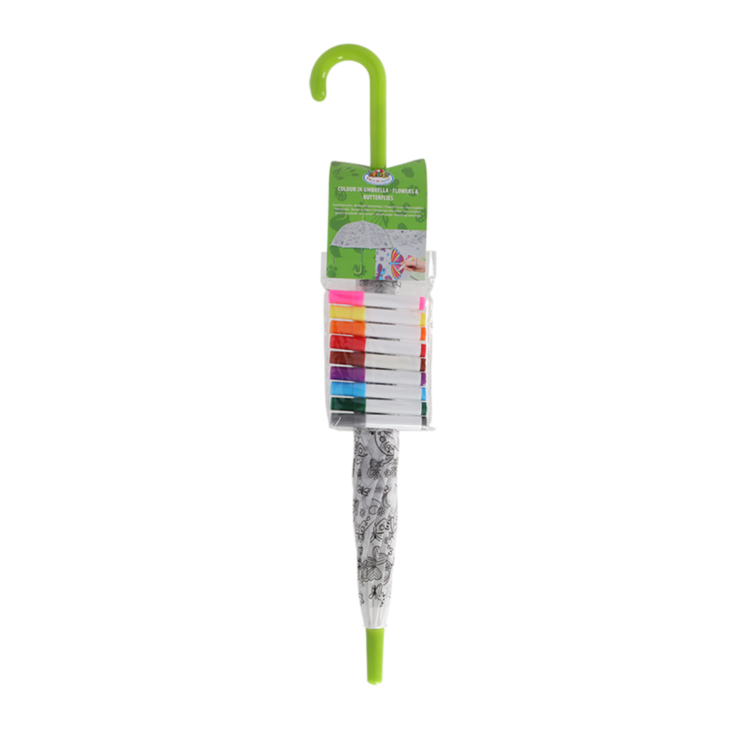 付属のカラーペンで塗り絵のように色を付けたり、自分のお名前を書いてみたり、遊びながら自分だけのオリジナルの傘を作れるカラー・イン・アンブレラ。