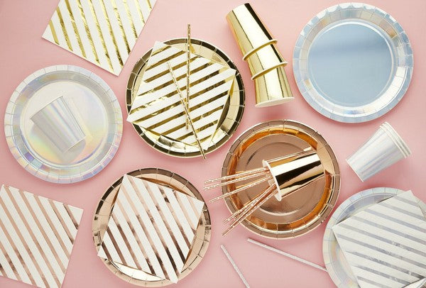 キラキラと輝きながらも、落ち着いたトーンのピンクゴールドのペーパープレート。