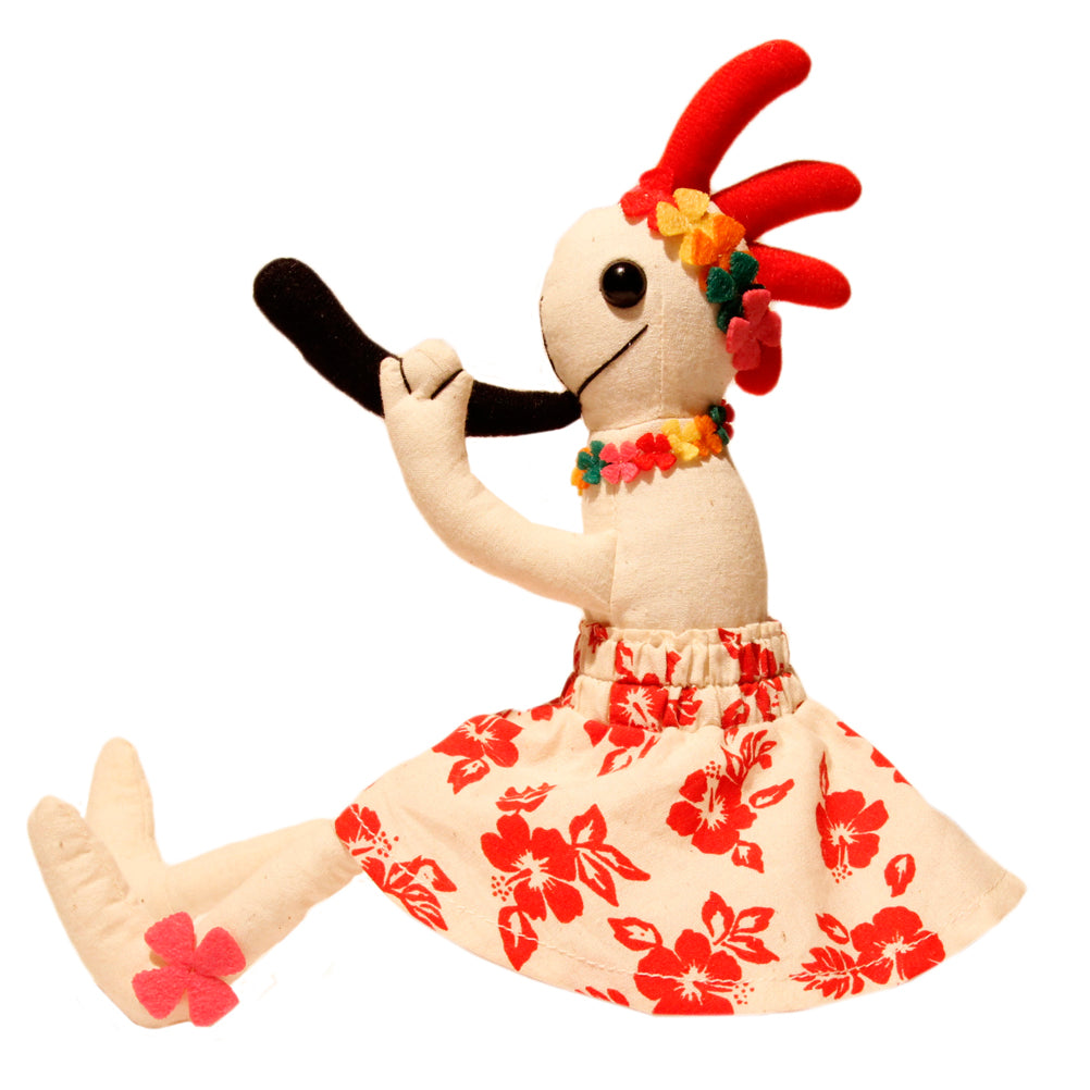 ネイティブ・アメリカンに伝わる精霊で、「ココペリ」が笛を吹き、幸福を運んでくると信じられています。その「ココペリ」が虹を渡り、Hawaii(虹の国)へ辿り着きました。