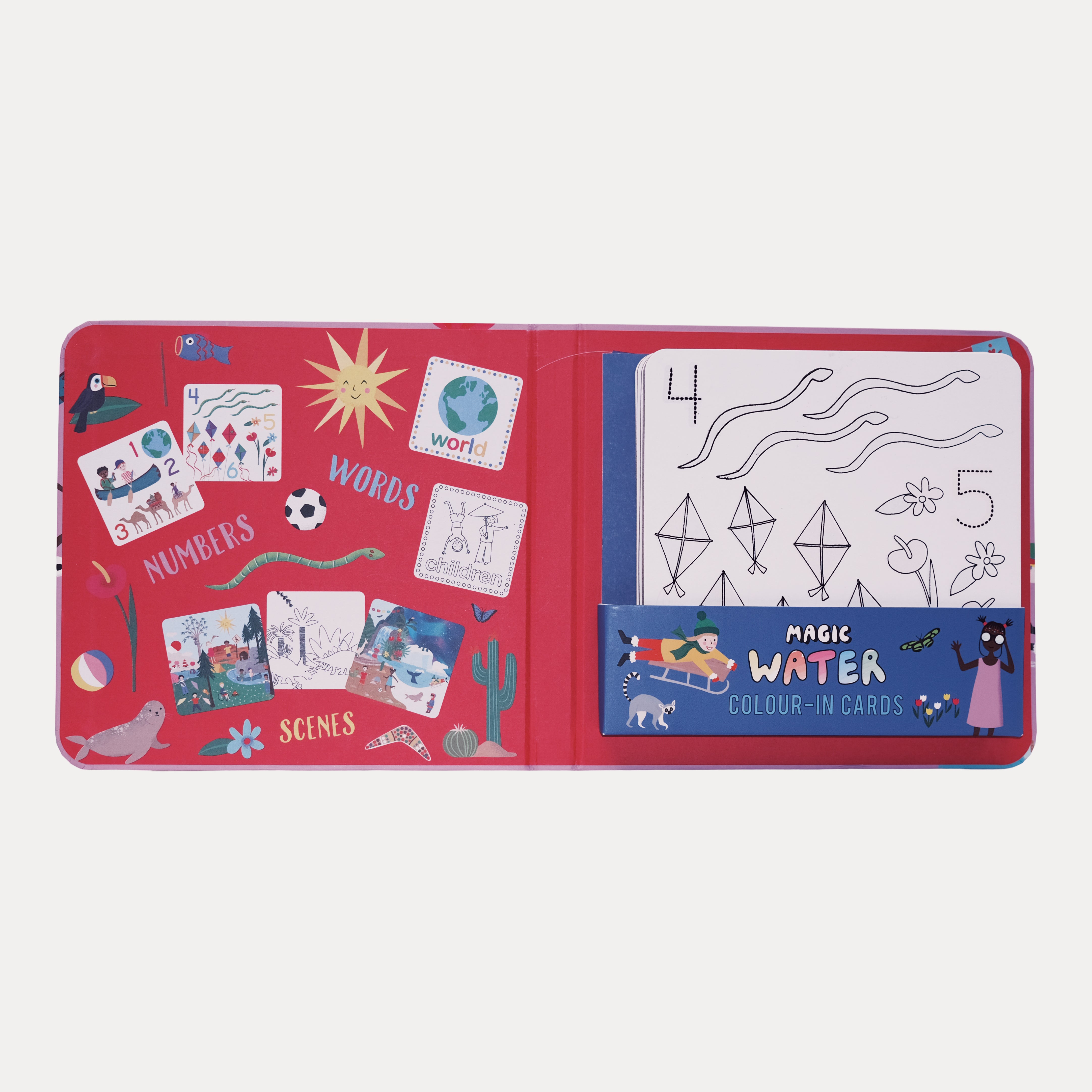コンパクトなブックタイプなので、バッグに入れて気楽に持ち運びできるところも人気の理由です。中身は水ですので、手や服の汚れを気にせず遊ぶことができます。