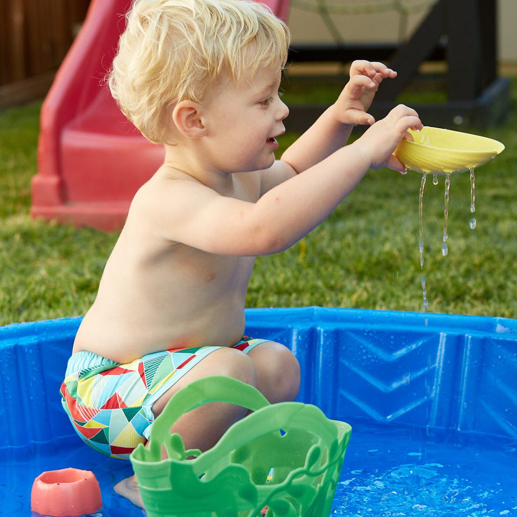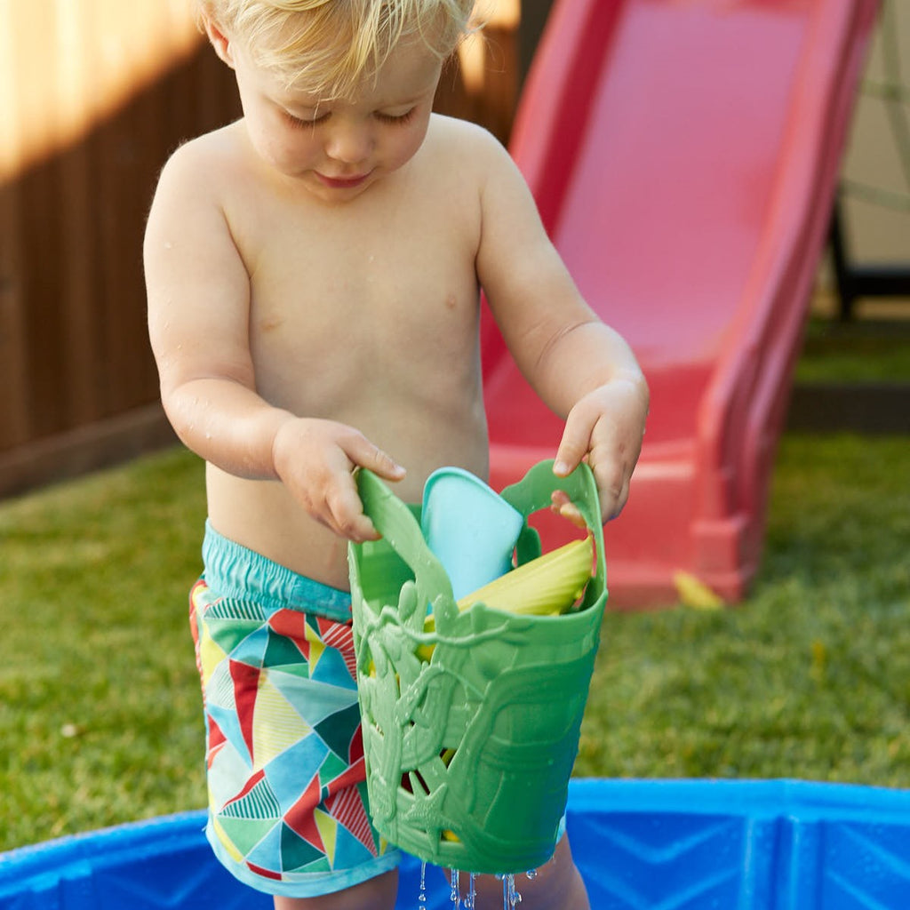 グリーントイズのおもちゃは、アメリカの家庭で使用されたミルクジャグを使って作られています。丁寧に洗浄され、細断し、原材料に再生された素材HDPE(高密度ポリエチレン)は、グリーントイズの丈夫なおもちゃの源です。