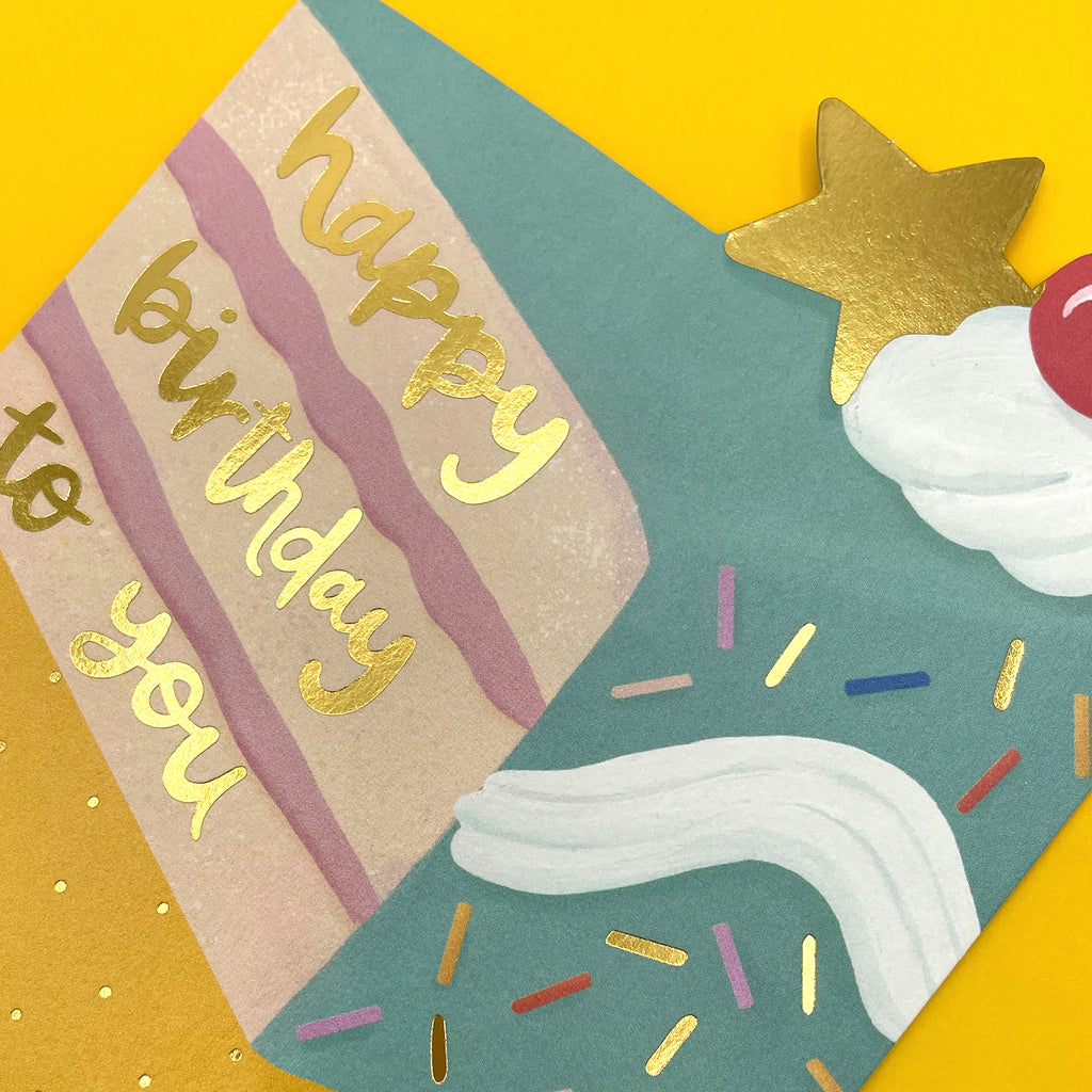食べたくなるほどリアルなケーキ型ダイカットに、上品な金箔の“Happy Birthday to you”メッセージが施された、贅沢なグリーティングカードです。