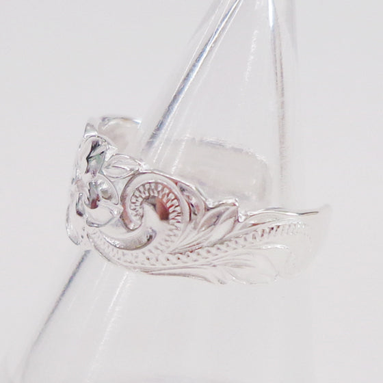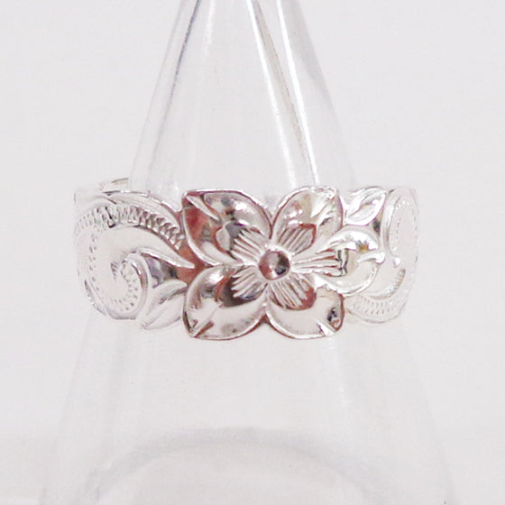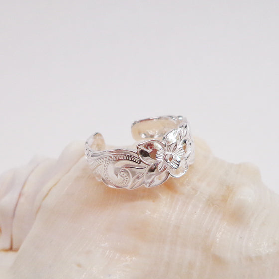 大きなプルメリアとスクロールがきれいに彫られたデザイン。足の指はもちろん、関節リングとしてもとってもかわいいフリーサイズのリングです。