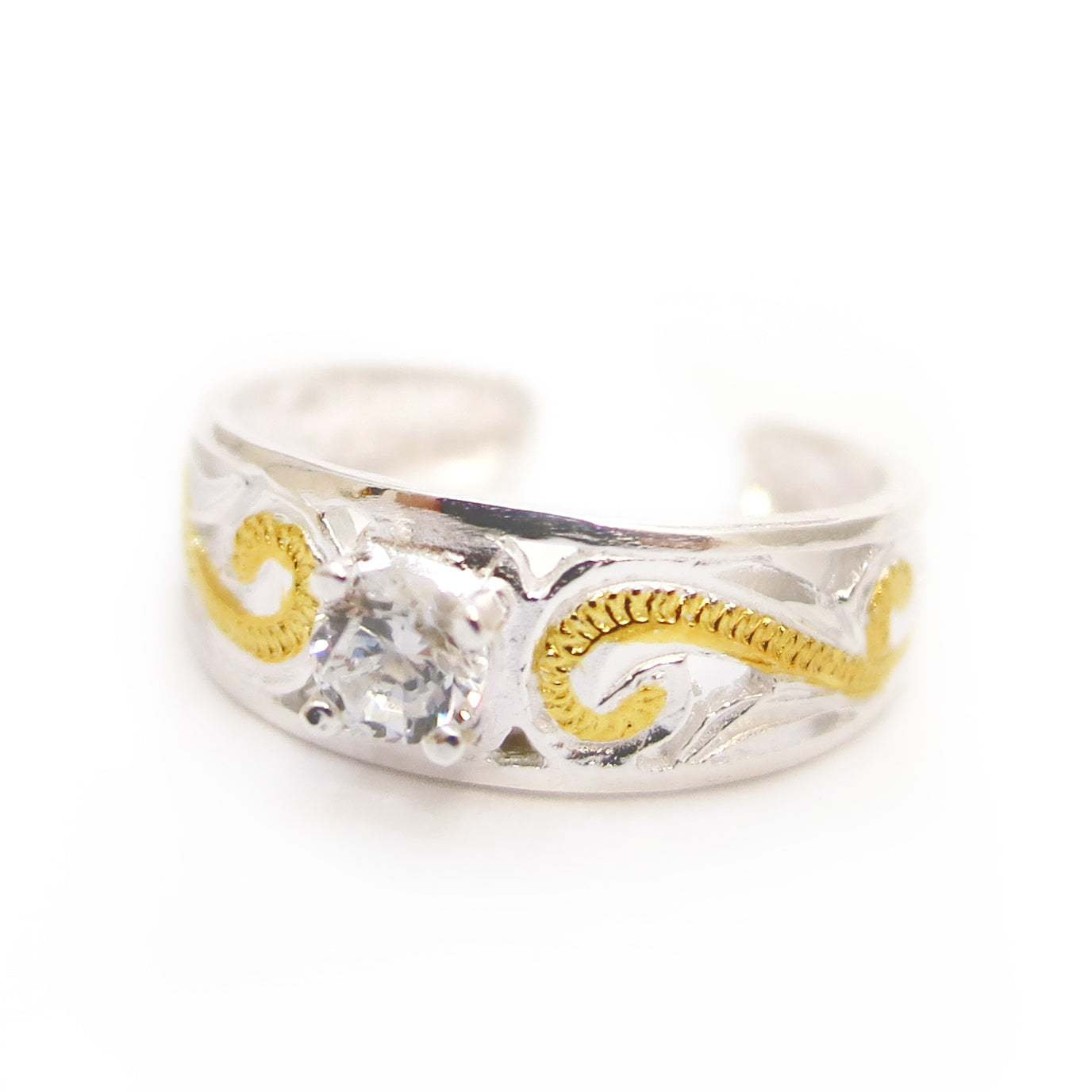 キュービックジルコニアと、スクロールがきれいに彫られたツートーンカラーのデザイン。足の指はもちろん、関節リングとしてもとってもかわいいフリーサイズのリングです。