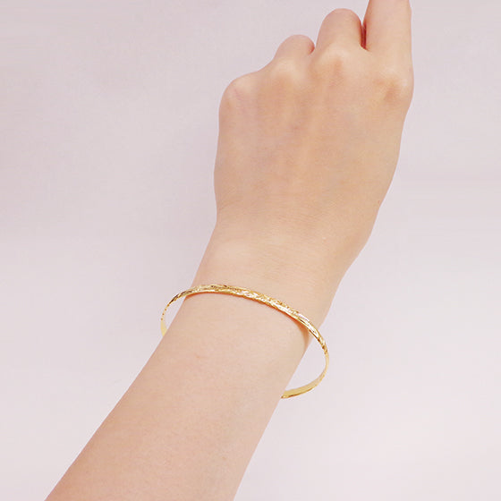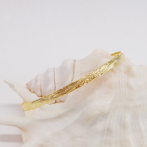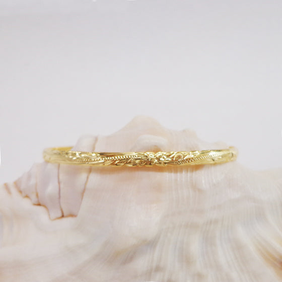 スクロールとプルメリアが彫られた美しいイエローのバングル。華奢なデザインながらも手元を華やかに彩ります。お持ちのバングルと重ね付けも◎!