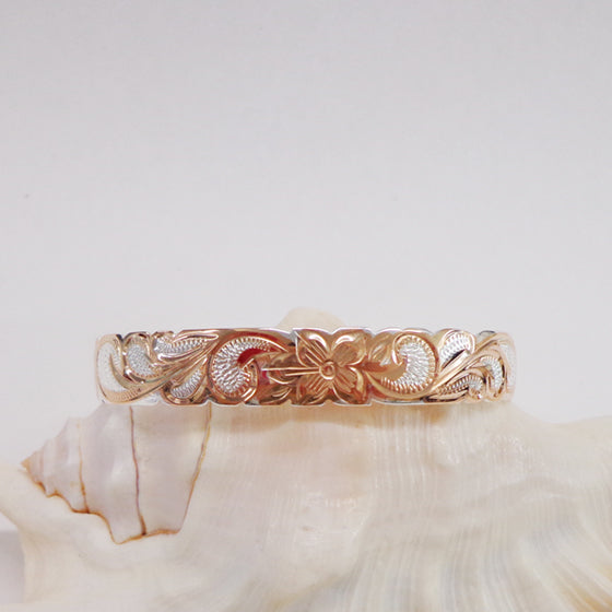細かく繊細なスクロールの彫りに、中央にはハワイを代表する花のプルメリアがデザインされています。