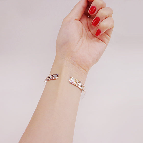 ピンクゴールドとシルバーのツートーンが美しく、12ミリの幅があるので存在感もたっぷりのシルバーバングルです。