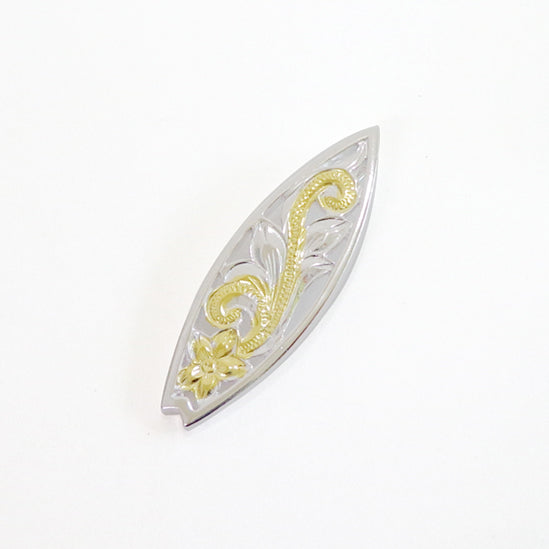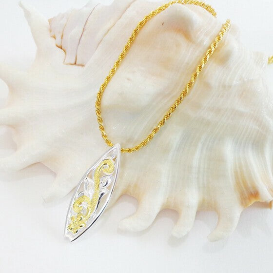 サーフボードを象ったフレームの中に、ハワイアンジュエリーで人気モチーフのマイレとプリメリアがデザインされ、ゴールドでコーティングされたペンダントトップ。