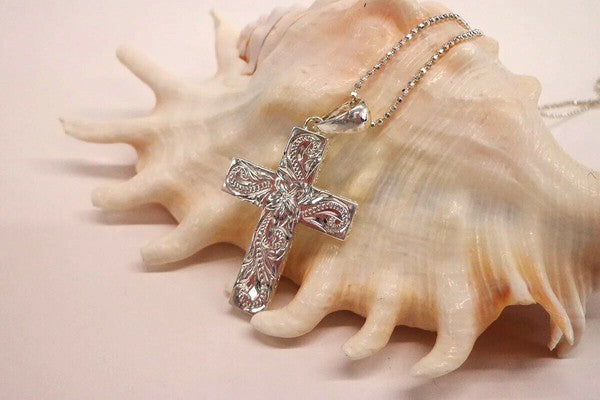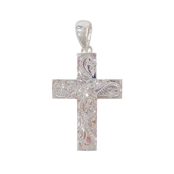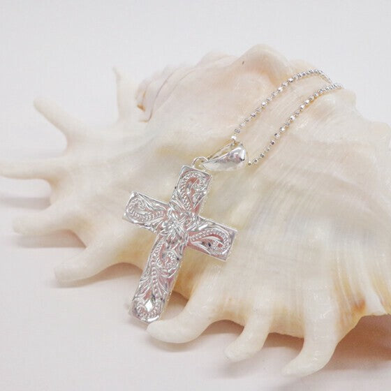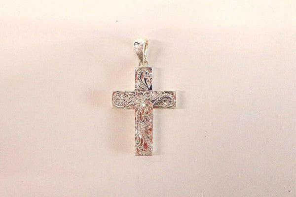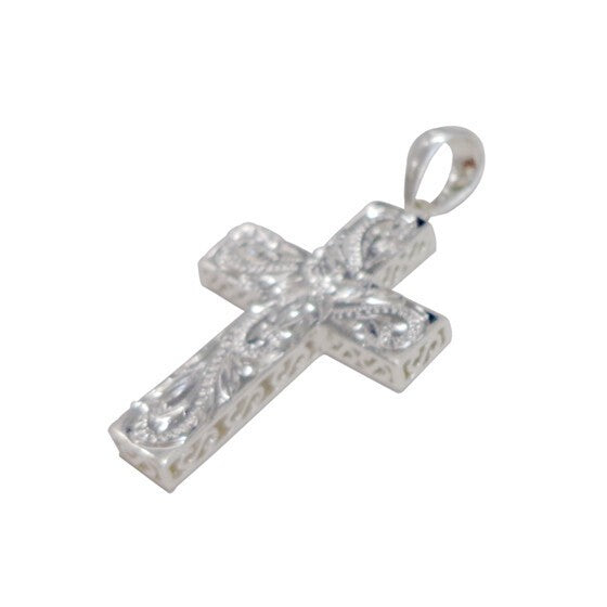 クロス型のデザインに、細かくて美しいスクロール(波)が掘られているペンダントトップです。