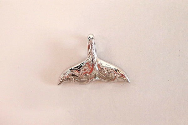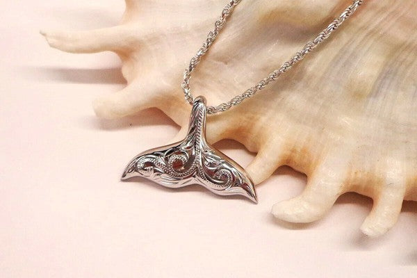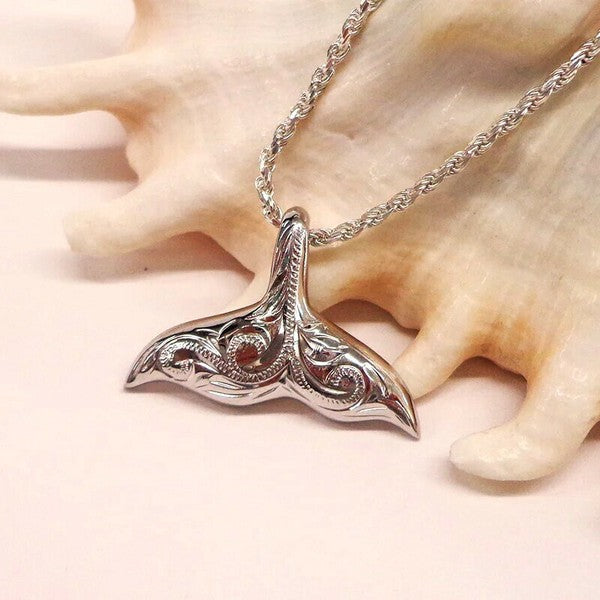 ハワイの海の守り神であるクジラの尻尾(ホエールテール)に、美しいスクロール(波)のレリーフが入ったペンダントトップです。