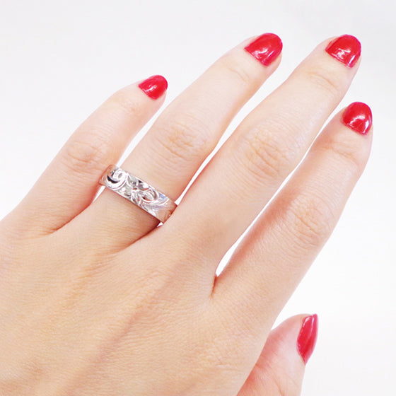 ハワイアンジュエリーで人気のモチーフであるスクロール(波)に、中央にプルメリアがデザインされたリングです。