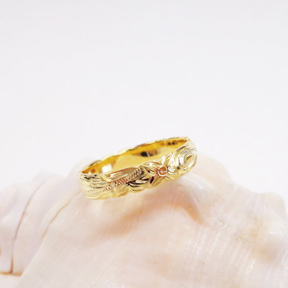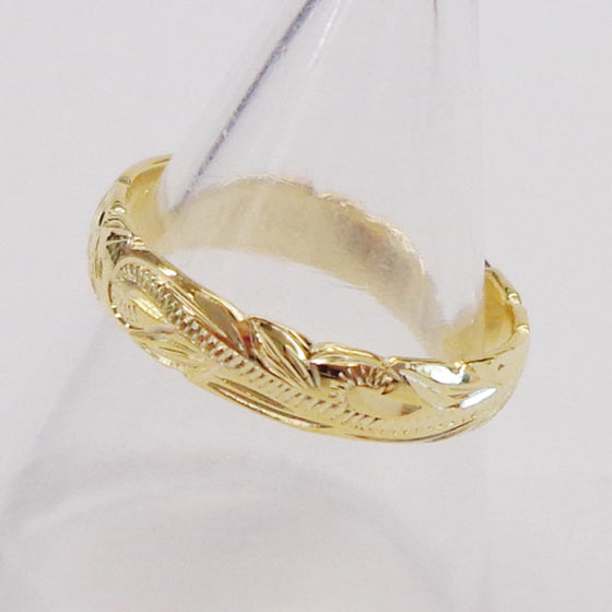 ハワイアンジュエリーで人気のモチーフであるスクロール(波)に、中央にプルメリアがデザインされたイエローゴールドコーティングのリングです。