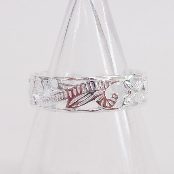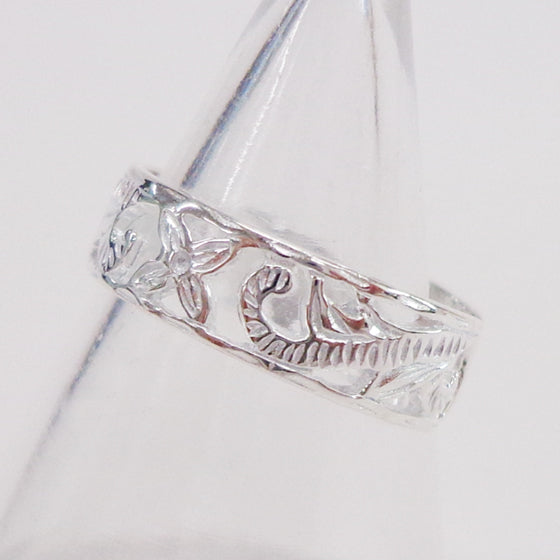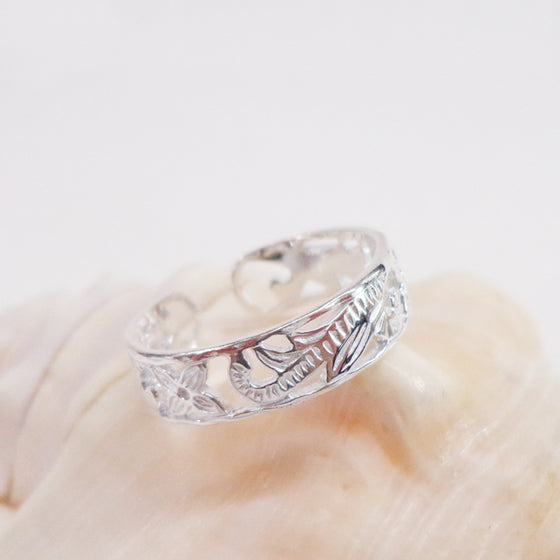 スクロールと中央に透かしで施されたスクロール(波)とプルメリアの彫りが繊細で美しい、足の指用のトゥリングです。