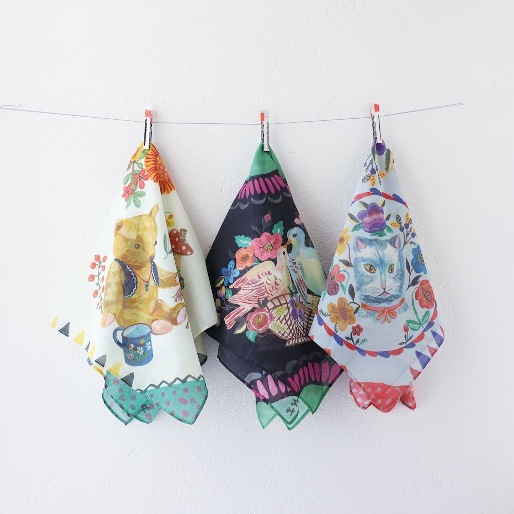 繊細なタッチと独特の色づかいがさらりとした薄手のコットンにやさしく溶け込んでいます。首元に巻いたり、バッグに結んだり、ちょっとしたギフトのラッピングにもおすすめ。