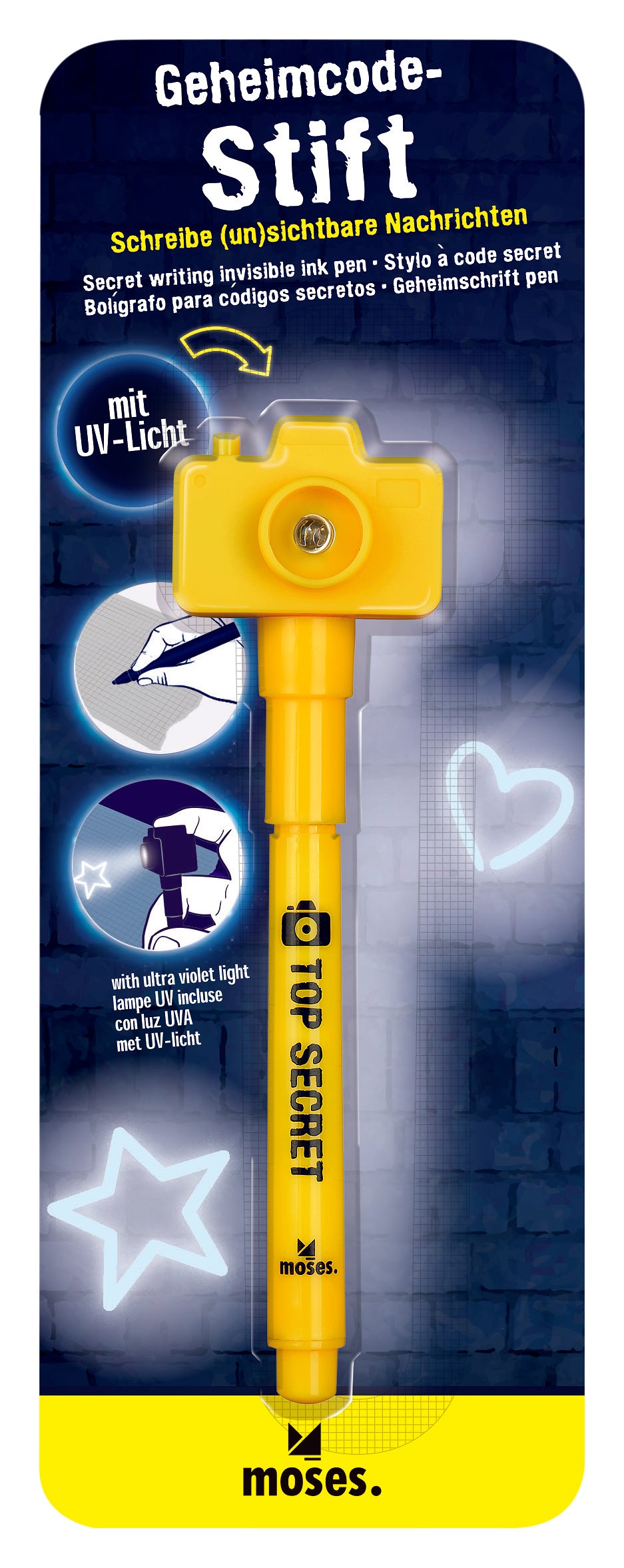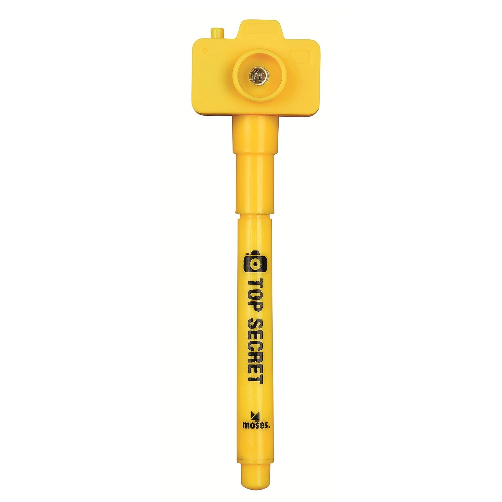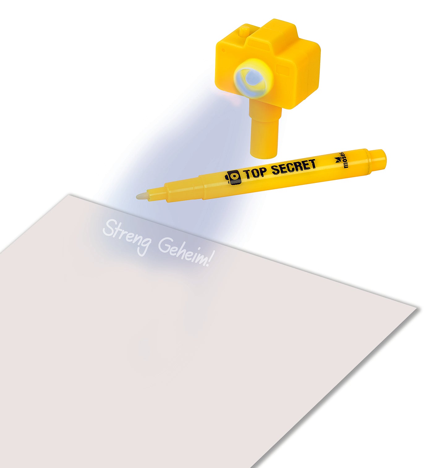 そのまま紙に何かを書いても何も見えません。 付属のカメラ型キャップのボタンを押して、 書いた場所にUVライトを当てると、不思議と書いたものが見えるように!