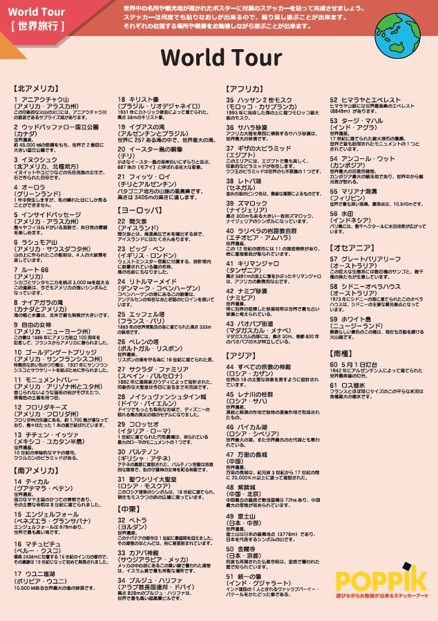 世界の名所や観光地が描かれているワールドツアー。日本はもちろん富士山が描かれています。ステッカーは貼り直し可能なので、何度でも繰り返し遊ぶことが出ます。