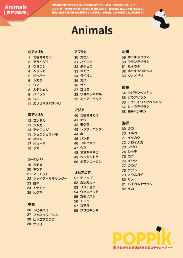 世界の大陸にいる動物たちや、日本では見ることのできない動物など、動物の名前と住んでいる地域を学びながら遊ぶことが出来ます。