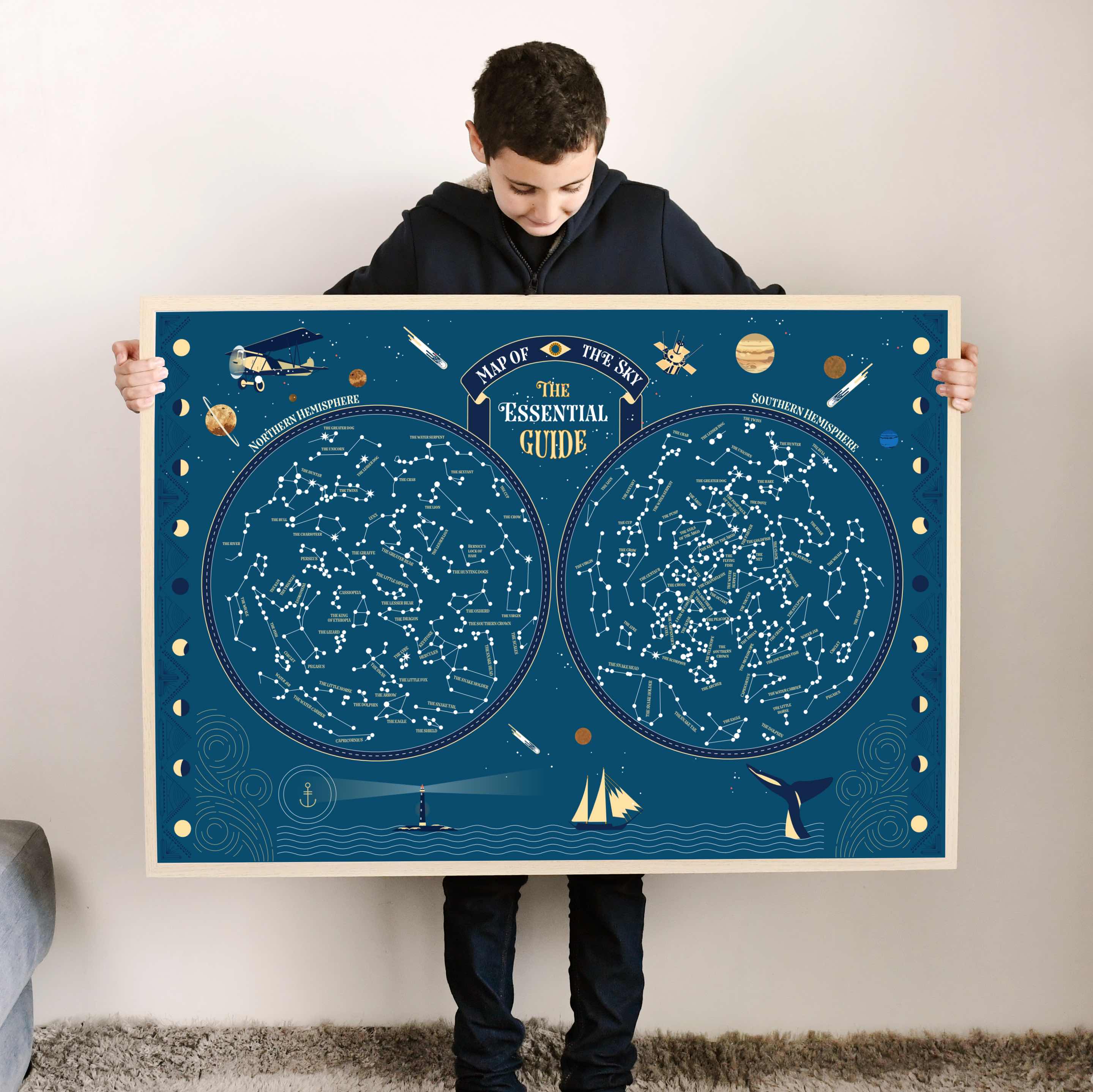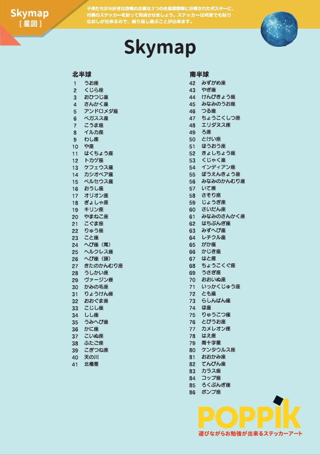 貼って剥がせる蓄光ステッカーを大きなポスターに貼っていけば、北半球と南半球から見える星と星座の世界が完成します。