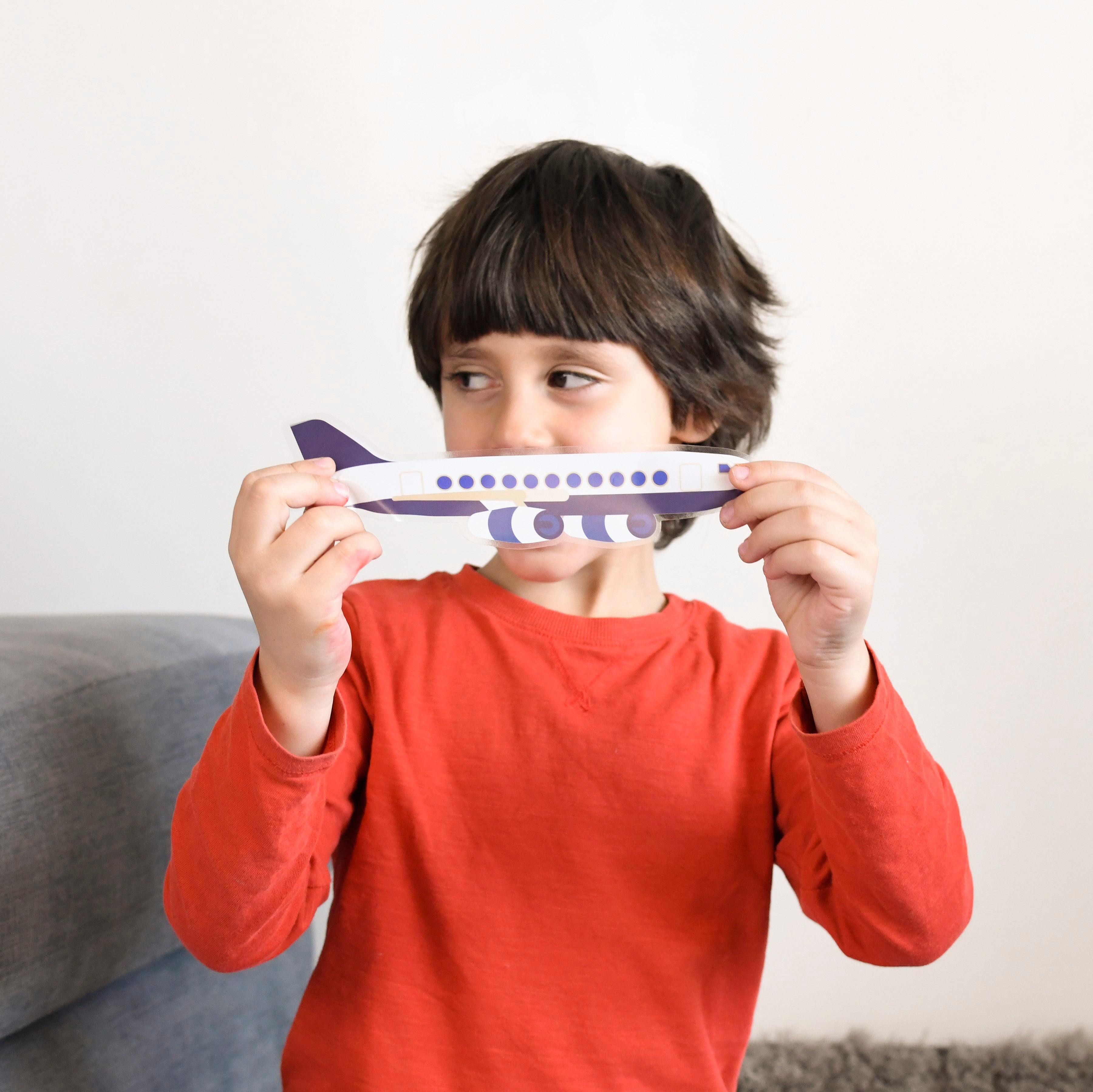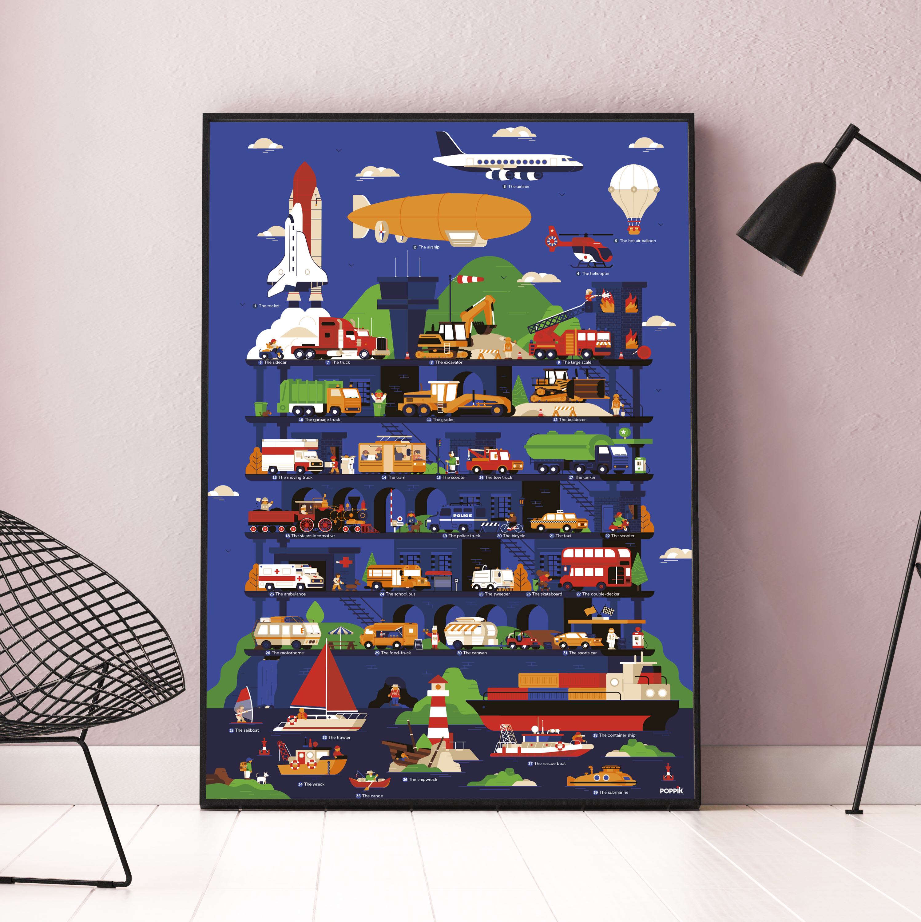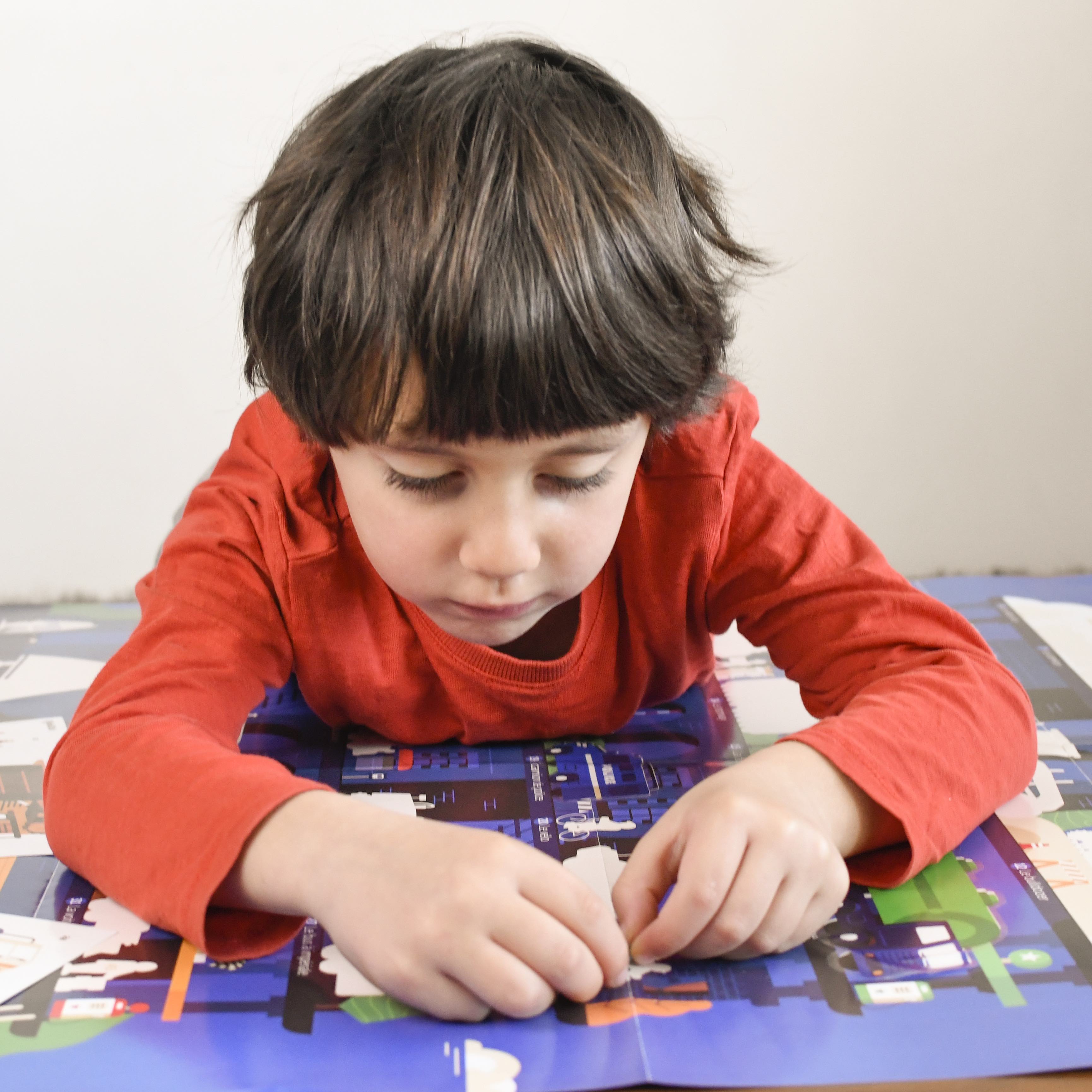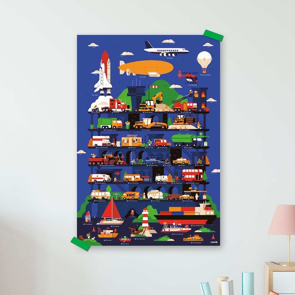 海、陸、空、そして宇宙へ向けて。色々な種類の乗り物が描かれているステッカーを貼って大きなポスターを完成させます。ステッカーは貼り直し可能なので、何度でも繰り返し遊ぶことが出ます。