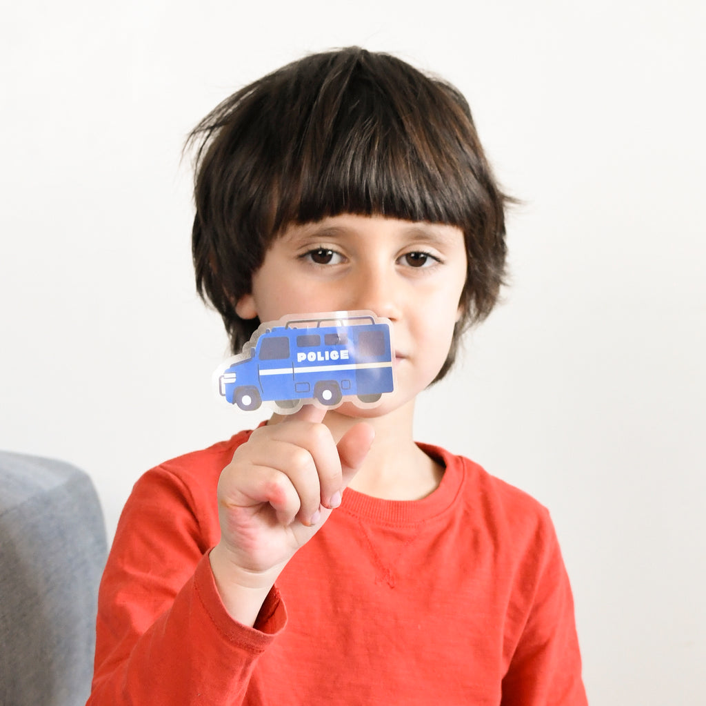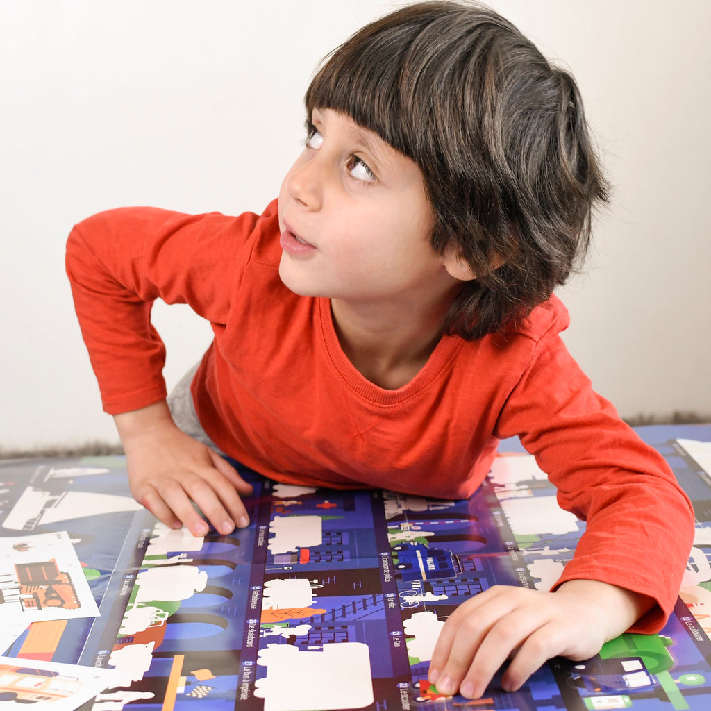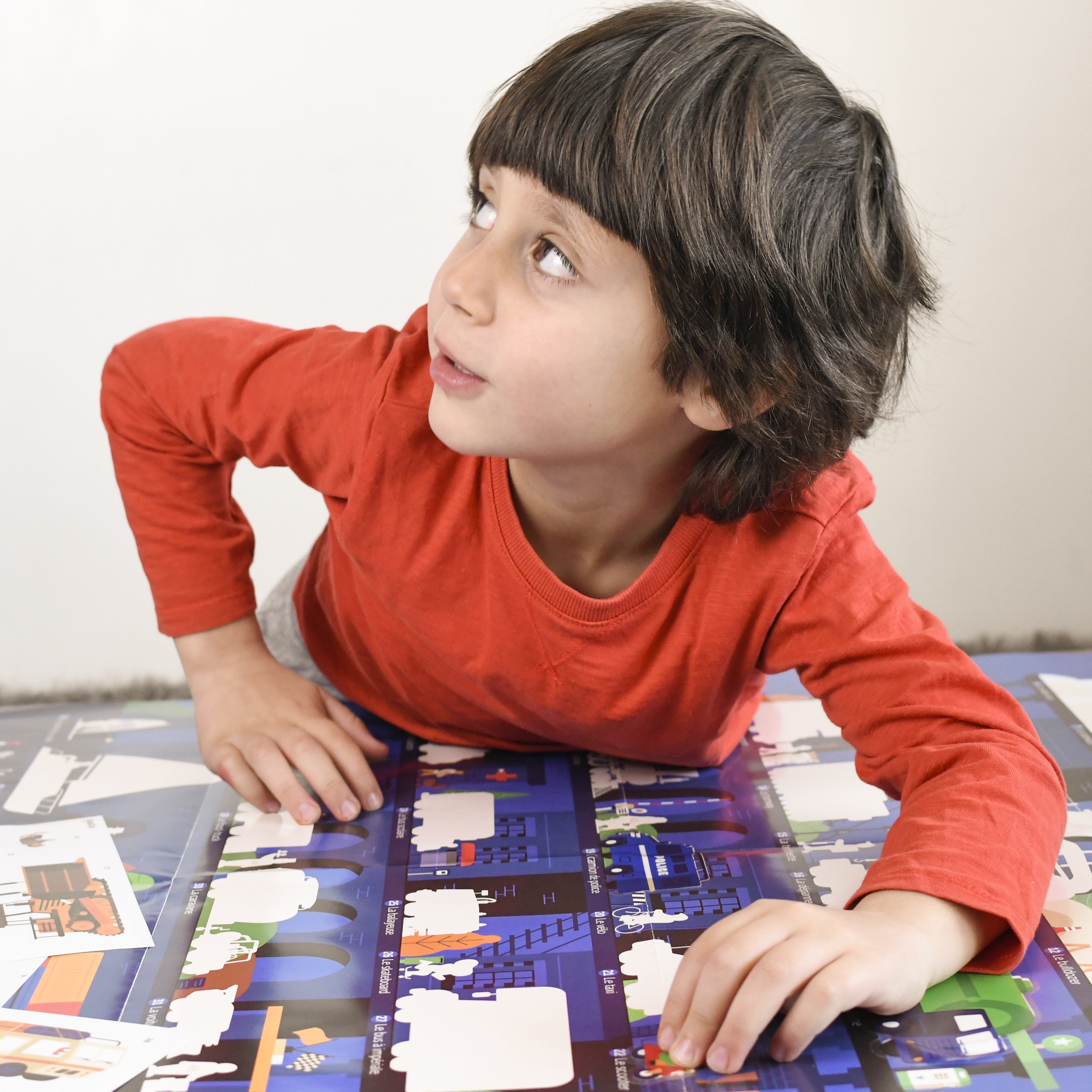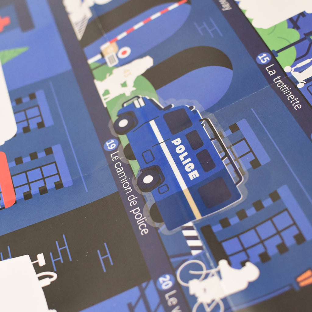 海、陸、空、そして宇宙へ向けて。色々な種類の乗り物が描かれているステッカーを貼って大きなポスターを完成させます。ステッカーは貼り直し可能なので、何度でも繰り返し遊ぶことが出ます。