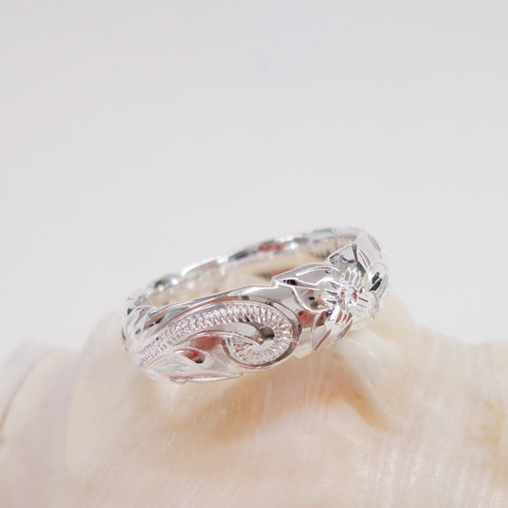 ハワイアンジュエリーで人気のモチーフであるスクロール(波)に、中央にプルメリアがデザインされたリングです。